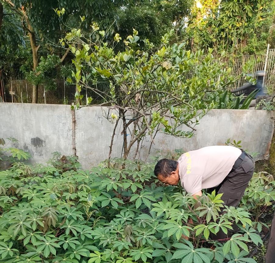 Kapolsek Cidadap Polrestabes Bandung Kompol Rudhi Gindriansyah, S.H., M.H., bersama KA SPKT Polsek Cidadap Polrestabes Bandung Aiptu Suwar, pada Hari Jumat, tanggal. 13 Desember 2024, melaksanakan kegiatan perawatan kebun ketela pohon, ubi dan pohon jeruk dalam rangka mendukung program ketahanan pangan Presiden RI Prabowo Subianto Di Kebun Ketahanan Pangan Depan Mako Polsek Cidadap Polrestabes Bandung Jalan DR. Setiabudhi Kelurahan Ledeng Kecamatan Cidadap Kota Bandung.