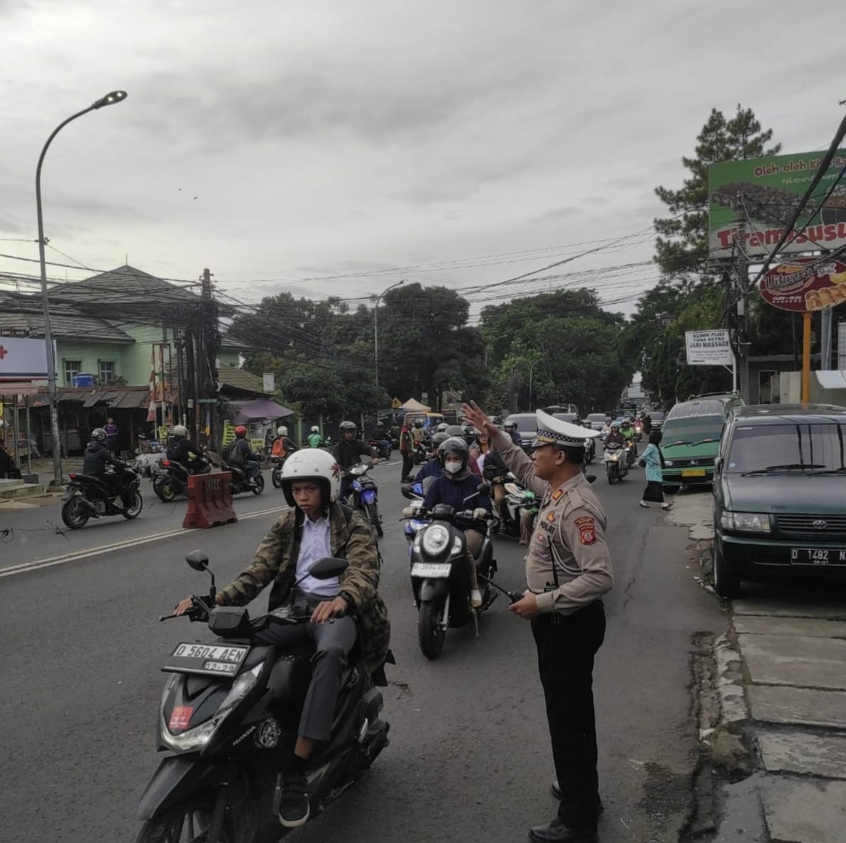 Polrestabes Bandung, Polda Jabar Polsek Sukasari.Antisipasi kemacetan pagi hari, personil lalulintas Polsek Sukasari melaksanakan pengamanan jalur di titik rawan kemacetan Wilayah Hukum Polsek Sukasari Polrestabes Bandung.