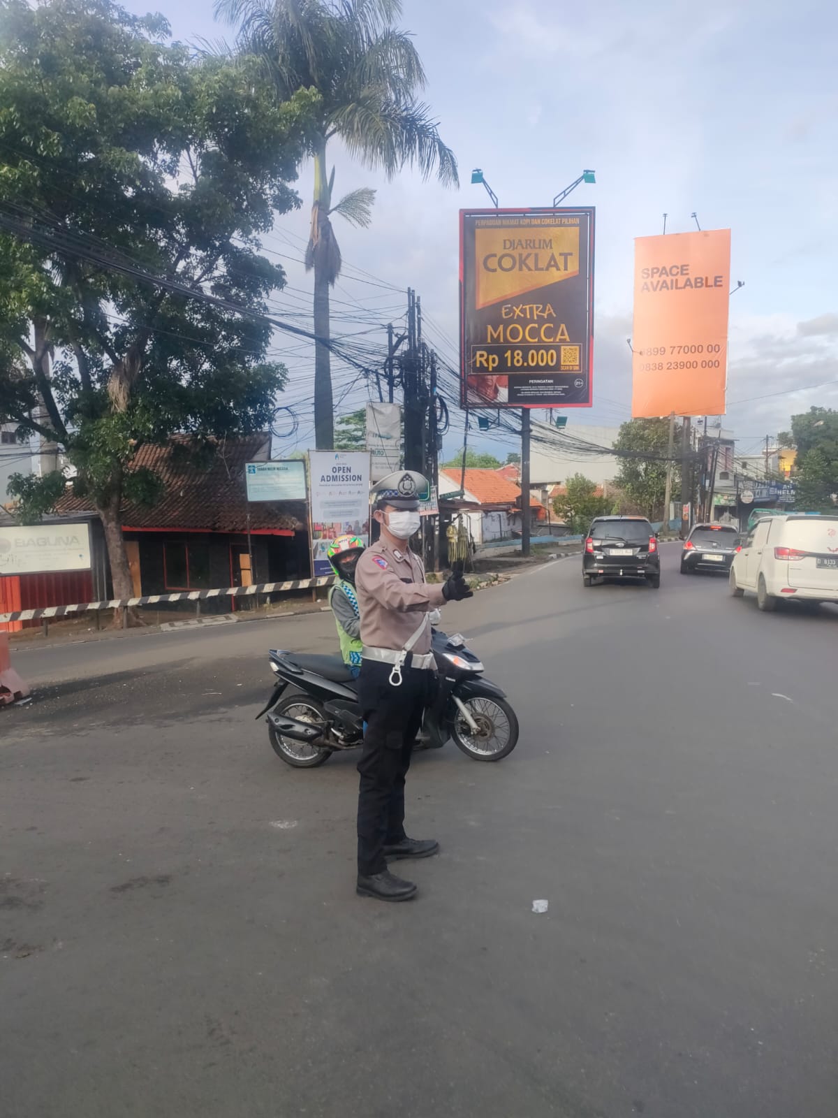 Personel lalulintas Polsek Arcamanik melaksanakan pengaturan antisipsi kemacetan pada pagi hari