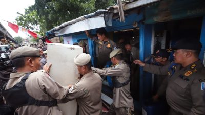 Lensanusantara.my.id | Satuan Polisi Pamong Praja (Satpol PP) Kota Bandung berkolaborasi dengan unsur TNI/Polri melanjutkan penertiban bangunan liar di depan Balai Yasa PT Kereta Api Indonesia (PT KAI), Jalan Ibrahim Adjie, Kiaracondong, Kamis 19 Desember 2024.