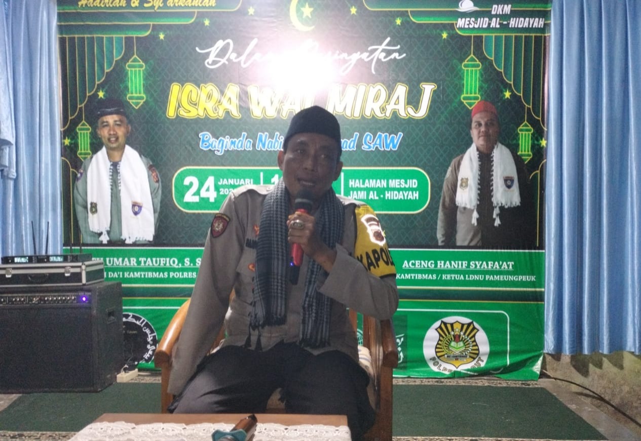 Dalam ceramahnya, Aiptu Umar mengupas tema “Peringatan Isro Mi’raj Nabi Muhammad SAW Menjadi Tauladan Kehidupan Bernegara Dengan Mencintai Tanah Air RI” yang mengajak jamaah untuk menjadikan nilai-nilai Islam sebagai landasan dalam menjaga persatuan dan mencintai tanah air.