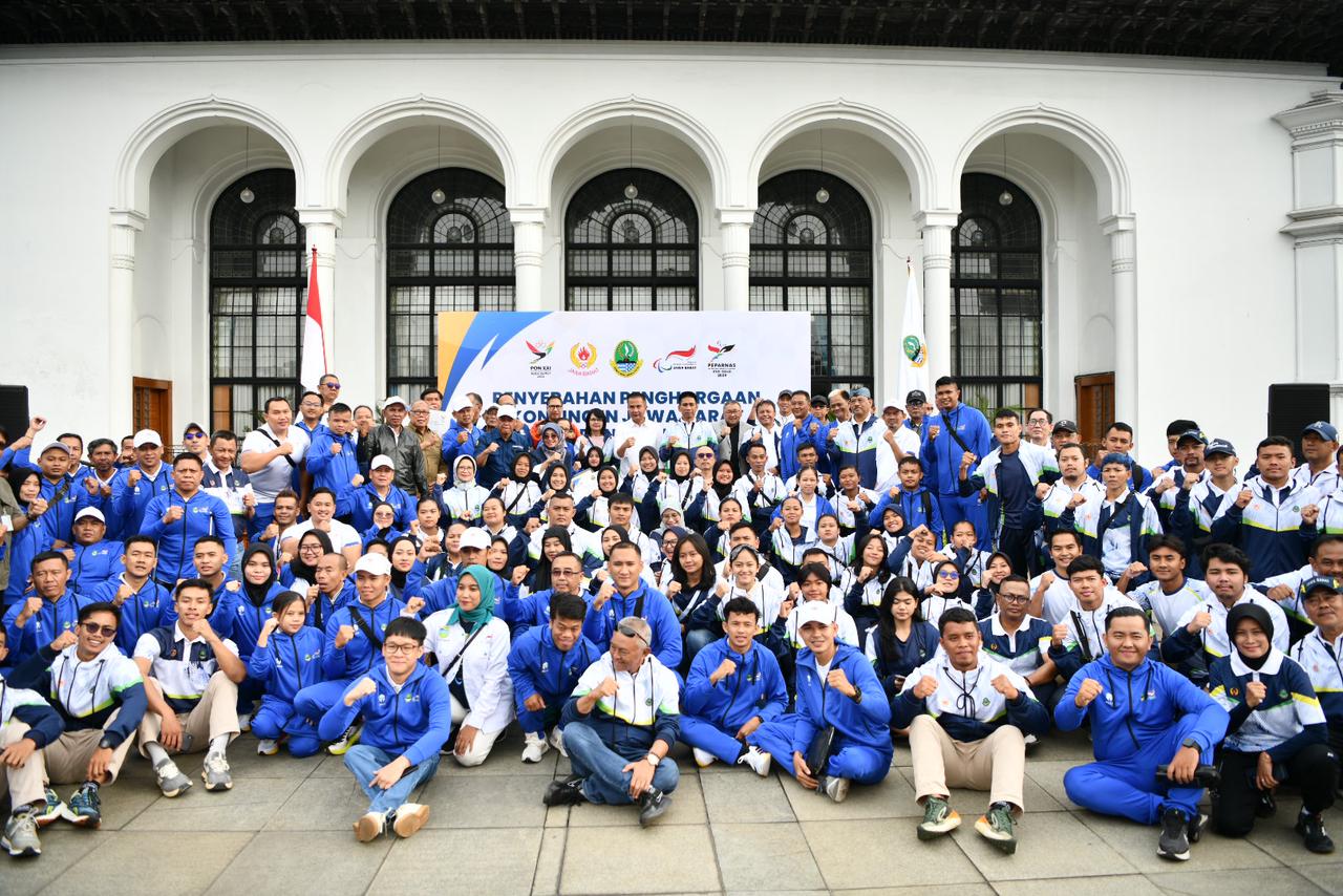 *Caption* : Penjabat Gubernur Jawa Barat, Bey Machmudin menghadiri penyerahan penghargaan Gubernur secara simbolis kepada aara Atlet, Pelatih dan Kontingen Jawa Barat pada PON XXI/2024 Aceh-Sumatera dan PEPARNAS XVII/2024 di Plaza Belakang Gedung Sate, Kota Bandung, Selasa (4/2/2025) (
