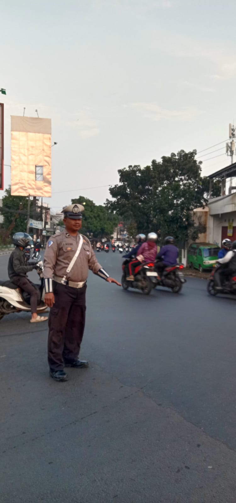 Personel lalulintas Polsek Arcamanik melaksanakan pengaturan antisipsi kemacetan pada pagi hari