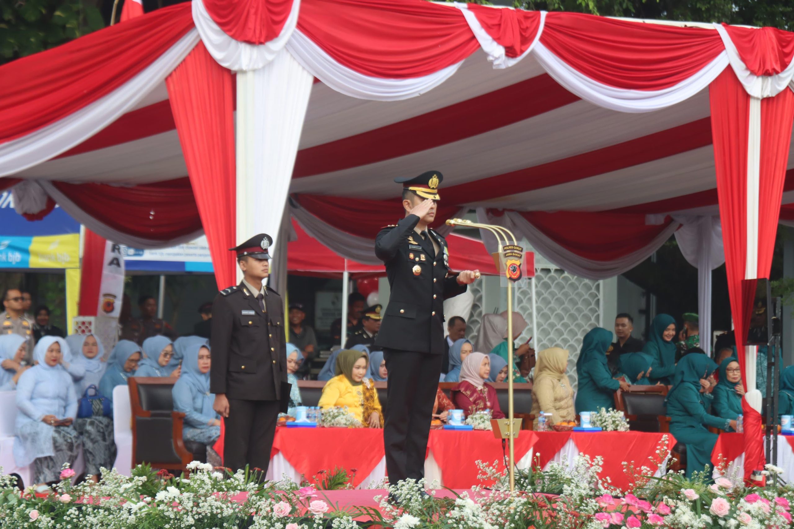 Kapolres Garut, AKBP Mochamad Fajar Gemilang, S.I.K., M.H., M.I.K., bertindak sebagai Inspektur Upacara, dengan AKP R. Hasan Sadikin, S.H. sebagai Komandan Upacara.