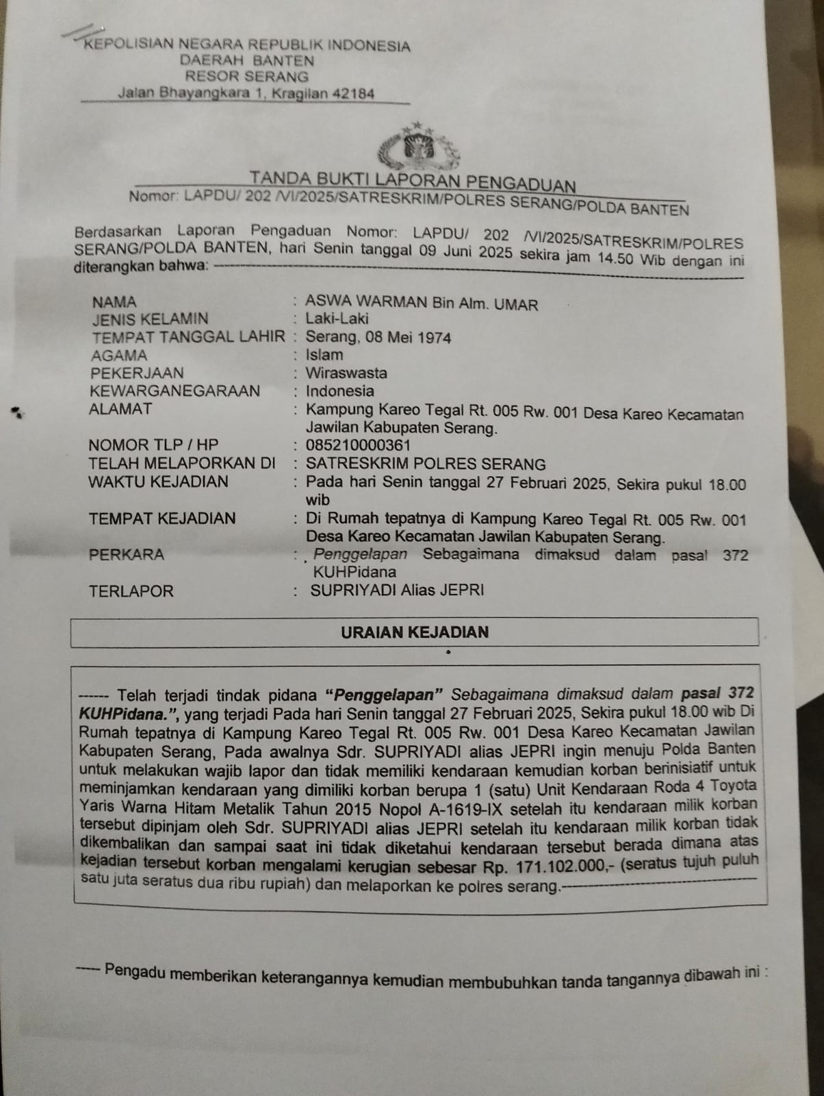 Ia menyatakan bahwa kendaraan tersebut merupakan miliknya secara sah, dengan Nomor Kontrak 014124210631 atas nama Aswa/Wawan, dan tidak pernah diserahkan secara formal sebagai jaminan kepada Jepri maupun pihak lain.