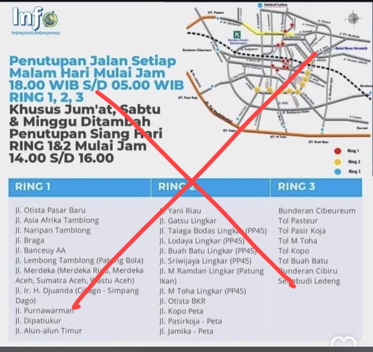 Lensanusantara.my.id-Baru-baru ini beredar informasi di media sosial yang menyebutkan adanya penutupan jalan besar-besaran di Kota Bandung. Mulai dari kawasan Ring 1 – Ring 3 seperti jalan protokol, Jalan Asia Afrika, Jalan Riau, dan jalan lainnya di Kota Bandung hingga pintu tol.