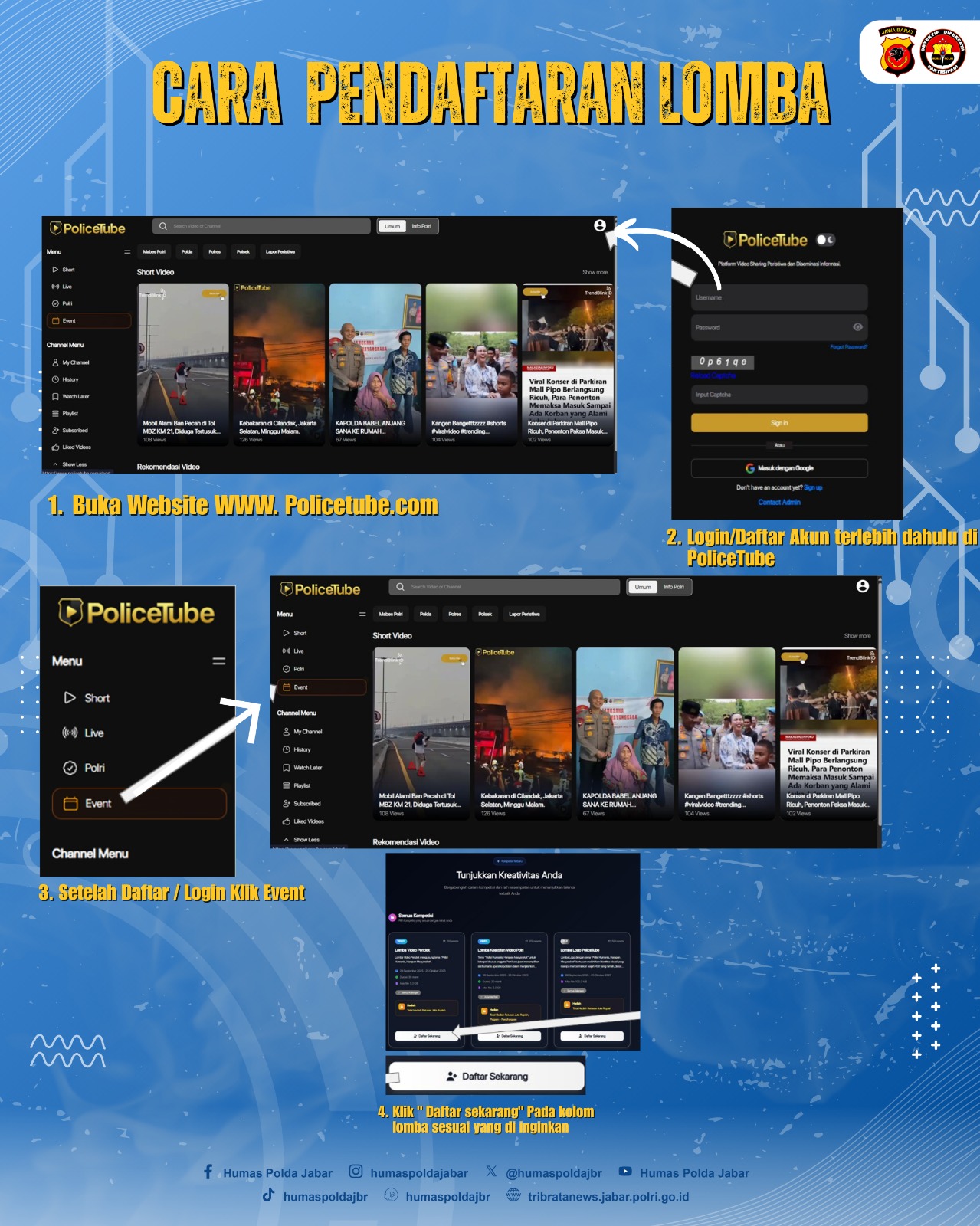 Pendaftaran dibuka mulai 1 hingga 25 Oktober 2025 melalui situs resmi www.policetube.com atau aplikasi PoliceTube. Seluruh peserta yang mendaftar akan mengunggah karya sesuai ketentuan lomba dan akan melalui tahap kurasi sebelum dinilai oleh dewan juri. Proses penjurian dijadwalkan berlangsung pada 26 Oktober 2025, dengan pengumuman pemenang dilakukan secara live streaming di media sosial resmi @Divisihumaspolri pada 27 Oktober 2025. Para pemenang akan diundang ke Jakarta pada 28 Oktober 2025 untuk menerima hadiah secara langsung.