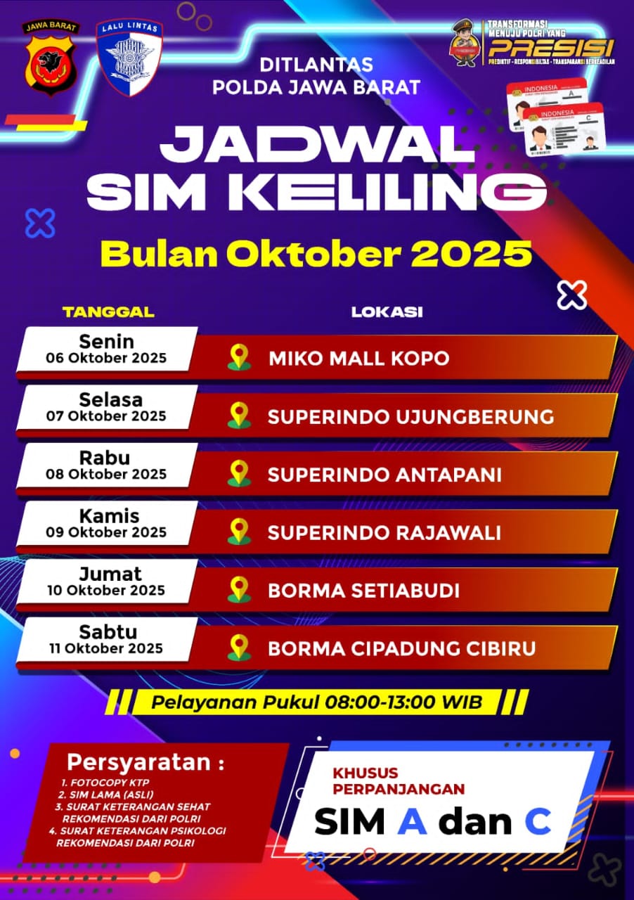 DITLANTAS POLDA JAWA BARAT UMUMKAN JADWAL SIM KELILING KOTA BANDUNG BULAN OKTOBER 2025