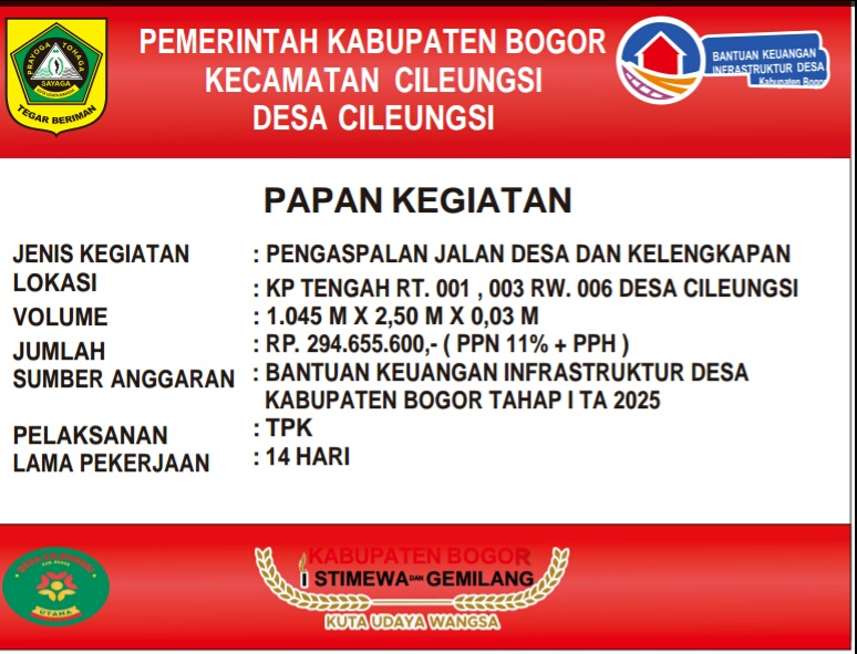 Proyek pengaspalan jalan ini menggunakan dana APBD Kabupaten Bogor Tahun Anggaran 2025 melalui program Bantuan Keuangan Infrastruktur Desa (BKID). Pekerjaan tahap pertama ini meliputi pengaspalan jalan sepanjang 1.045 meter, lebar 2,5 meter, dan tebal 3 cm, yang berlokasi di Jalan Gg. Bersama, Kampung Tengah, RT 001 dan RT 003 RW 006 Kadus III, Desa Cileungsi. Anggaran yang dikucurkan untuk tahap awal ini sebesar Rp294.655.600, dan seluruh pekerjaan dilaksanakan oleh Tim Pelaksana Kegiatan (TPK) Desa Cileungsi dengan sistem swakelola, melibatkan langsung warga setempat.