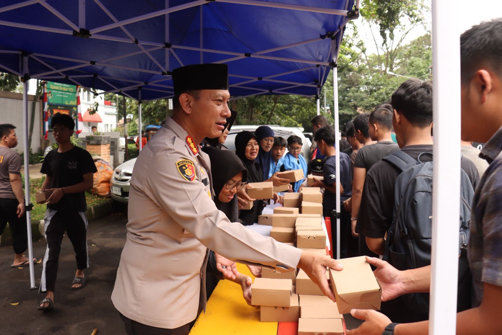 Dalam suasana penuh kehangatan, Kapolrestabes Bandung bersama Wakapolrestabes, para PJU, Kabag Ops, Kasi Humas, ibu-ibu warga Aspol Nias, serta Mojang Lodaya Polrestabes Bandung turut langsung melaksanakan kegiatan berbagi dengan membagikan 800 box snack dan 200 minuman segar kepada para jamaah. Selain itu, Kapolrestabes Bandung Kombes Pol Dr. Budi Sartono, S.I.K., M.Si., M.Han bersama Wakapolrestabes, para PJU, Kabag Ops, dan Kasi Humas Polrestabes Bandung juga menyerahkan paket sembako secara langsung kepada marbot Masjid Ad Dzikrulloh sebagai bentuk kepedulian dan apresiasi atas pengabdiannya dalam menjaga kebersihan serta kenyamanan masjid.
