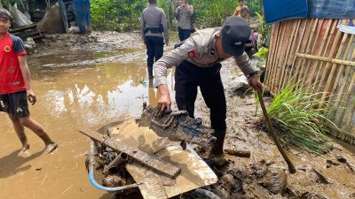 Polres Garut dan Unsur Forkopimcam Laksanakan Kerja Bakti Pembersihan Dampak Bencana Banjir